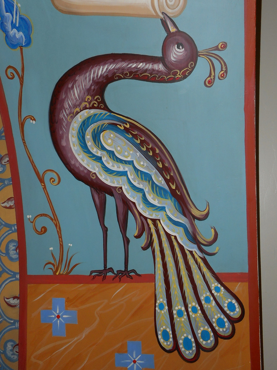 .). This small hut showcases colorful markings, a religious figure at bottom